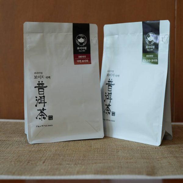보이차는 중국에서 오래전부터 널리 알려진 명차로 정식 명칭은 푸얼차입니다. 대엽종 찻잎을 쪄서 발효시킨 녹차 덩어리를 오래 묵혀 발효가 잘 진행된 것 일수록 좋은 차로 여겨집니다. 잘 발효된 보이차는 쓰거나 떫지 않고 특유의 맛을 가지고 있습니다. “할아버지가 만들면 손자가 마신다”는 말이 있을 정도로 긴 시간 발효됩니다.